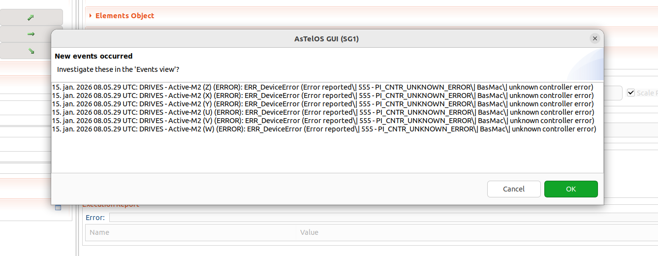 Tried numerous times to clear the error in Astelos during telescope startup, but without success. |
